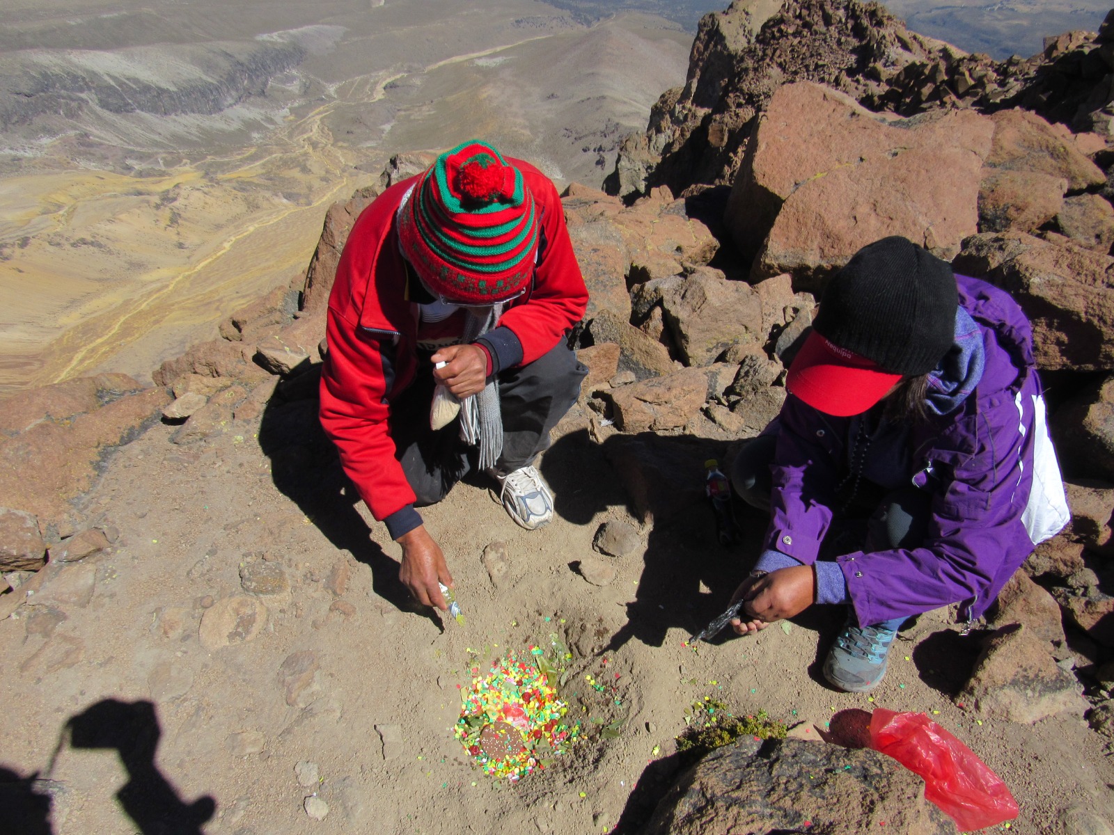Es un mirador inmejorable para apreciar un impresionante paisaje volcánico: Misti, Chachani, las siete cumbres del Pichu Pichu, Coropuna, Sabancaya, Ampato, Hualca Hualca, Ubinas, Ticsani, además de la laguna de Salinas. Como es costumbre, ya en la cumbre se realizó un pago a la montaña por permitir la incursión de los andinistas.