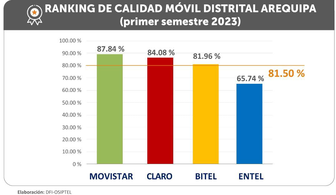Tras el procesamiento de información también se verificó que, con respecto al promedio ponderado por tráfico a nivel de los distritos de la provincia de Arequipa, Movistar alcanzó el índice de calidad móvil más alto de las cuatro empresas operadoras, con 87.84 %. Le siguieron Claro (84.08 %), Bitel (81.96 %) y Entel (65.74 %). De esta manera, el promedio general de las operadoras llegó a 81.50 %, lo que significó un retroceso de 2.6 % respecto al mismo periodo de 2022 (84.10 %).