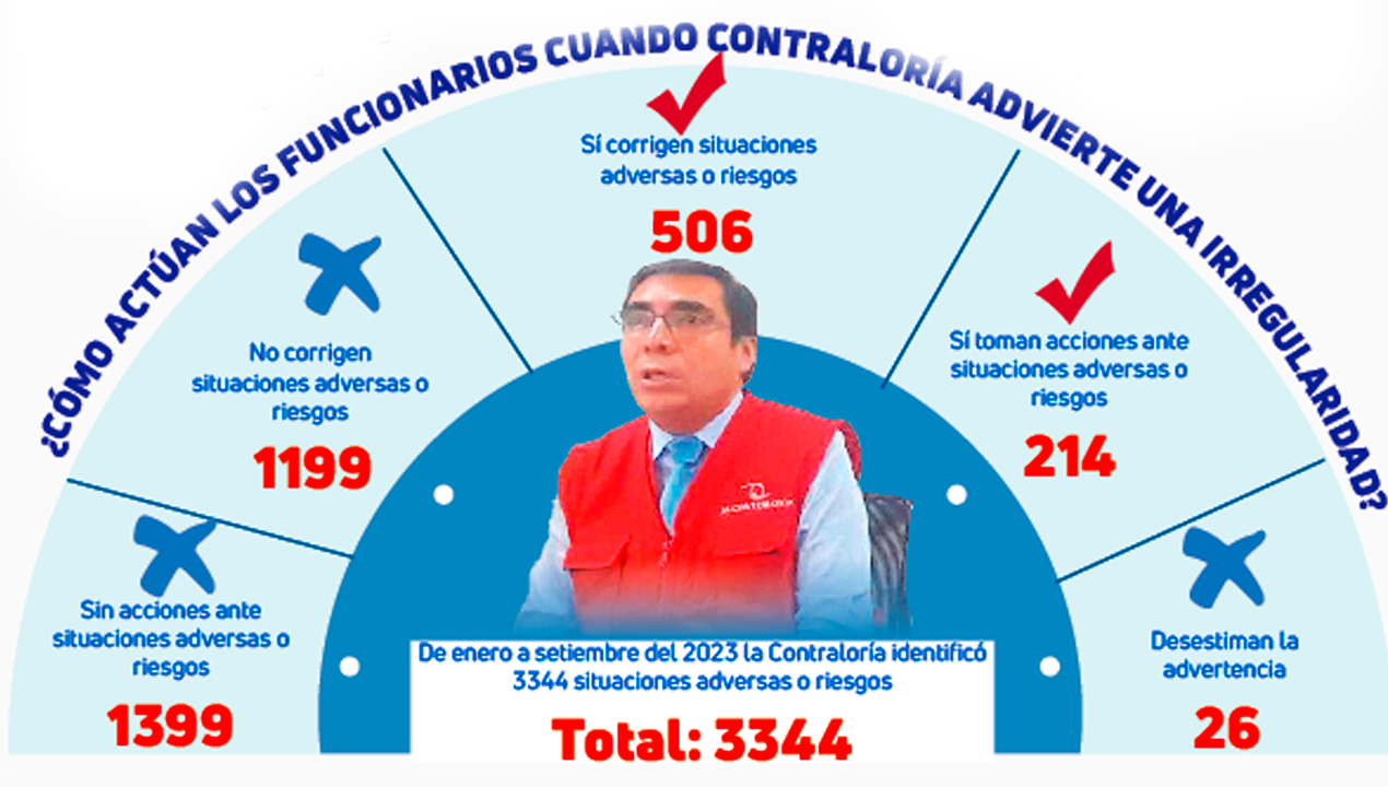 Arequipa. La Contraloría informó que solo 720 de las 3344 situaciones adversas, que identificaron en obras e instituciones de Arequipa, fueron corregidas o tomaron acciones. Es decir, los funcionarios y autoridades hicieron caso omiso a 2624 advertencias por el órgano contralor. Asimismo, informó que hasta la fecha hallaron un perjuicio de más de S/20 millones al Estado.