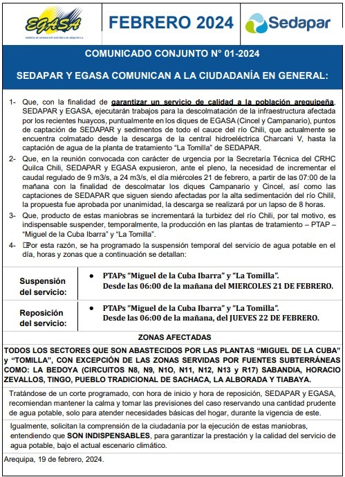 La empresa de Sedapar y Egasa anunciaron la suspensión temporal del servicio de agua potable desde el miércoles 21 de febrero debido a los trabajos de descolmatación que van a realizar en los diques de Cincel y Campanario tras verse afectados por el ingreso de los huaicos.
