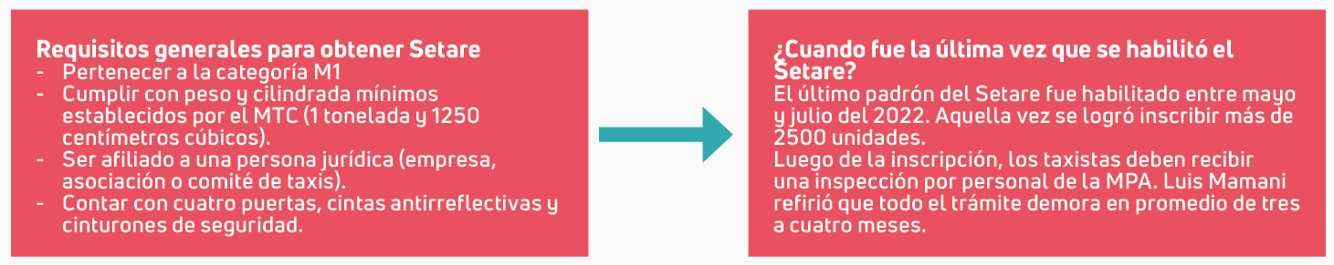 De acuerdo a cifras de Creat, se tienen un promedio de 32 mil taxistas que actualmente circulan y cuentan con Setare. Por su parte, Mamani afirma que un promedio de 5 mil unidades actualmente se encuentran en la informalidad pero cumplirían los requisitos que pide el Ministerio de Transportes y Comunicaciones (MTC) para formalizarse.