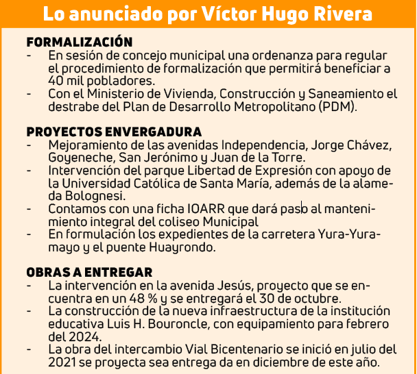 En su mensaje por el 483.° aniversario de Arequipa, el alcalde provincial Víctor Hugo Rivera señaló que uno de los más grandes proyectos que impulsaría su gestión sería la construcción de un teleférico que recorrerá las chacras de los distritos de Sachaca, Uchumayo y Hunter.