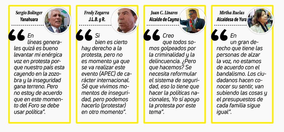 Los alcaldes de los distritos de la ciudad de Arequipa dieron a conocer su opinión acerca de la paralización del 13, 14 y 15 de noviembre anunciada por diferentes gremios del transporte a nivel nacional. Además, coincidieron en que cada ciudadano, por lo menos una vez, fue víctima de la delincuencia. Sin embargo, también expresaron que no debía darse dicha movilización porque afecta la imagen del Perú ante el desarrollo del Foro de Cooperación Económica de Asia Pacífico (APEC, siglas en inglés).