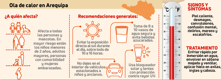 La región de Arequipa entró en alerta epidemiológica ante el golpe de calor. La especialista de la Dirección Ejecutiva de Epidemiología, Katia Luque, señaló que Arequipa cumplirá con la medida promulgada por el Ministerio de Salud, la alerta es una medida de prevención para que todos los centros de salud atiendan a pacientes que sufren descompensación por las altas temperaturas, afirmó.