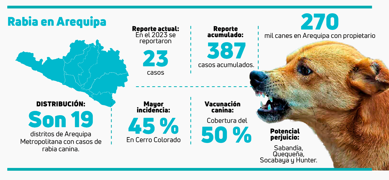 MORDEDURAS DE PERRO. El especialista Gonzales informó que durante el 2023, en nuestra región se dieron más de 5 mil casos de morduras de canes a personas, de este número solo 23 presentaban indicadores de rabia, los cuales fueron atendidos a tiempo. Cerro Colorado es el distrito con mayor afectación con el 45 % de los incidentes. Entre el último año subió también la cifra en Quequeña, Sabandía, así como Socabaya y Hunter.