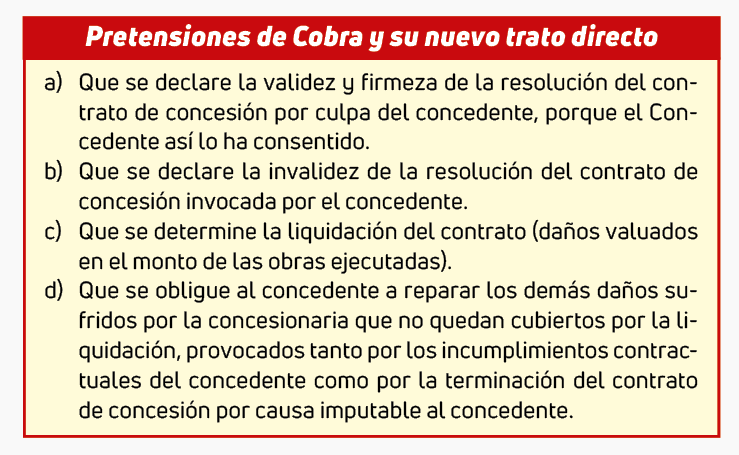 Mediante oficio simple con referencia n.° MS2-CAS-MEF-CAR-010, la empresa española Cobra, encargada de la ejecución del proyecto Majes Siguas II, propuso al Gobierno Regional de Arequipa (GRA), el inicio de un nuevo “trato directo” y resolución (caducidad) del TUO del contrato de concesión, esto en el marco a la cláusula 15.1(III.1). Es decir, un nuevo diálogo entre concedente y concesionario, el cual se desarrollaría durante los próximos seis meses antes de un posible arbitraje internacional.