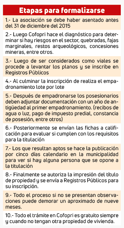 PROGRAMACIÓN. El jefe de Cofopri dio a conocer que no tienen la cantidad exacta de las personas que aún no cuentan con sus títulos de propiedad, por ello el personal de dicha entidad desde fines de agosto e inicios de setiembre han recorrido algunos distritos de las provincias de La Unión y Condesuyos, además están repasando Yura, Cerro Colorado, Socabaya, José Luis Bustamante y Rivero a fin de tener la información real respecto a todo lo que está pendiente a formalizar.