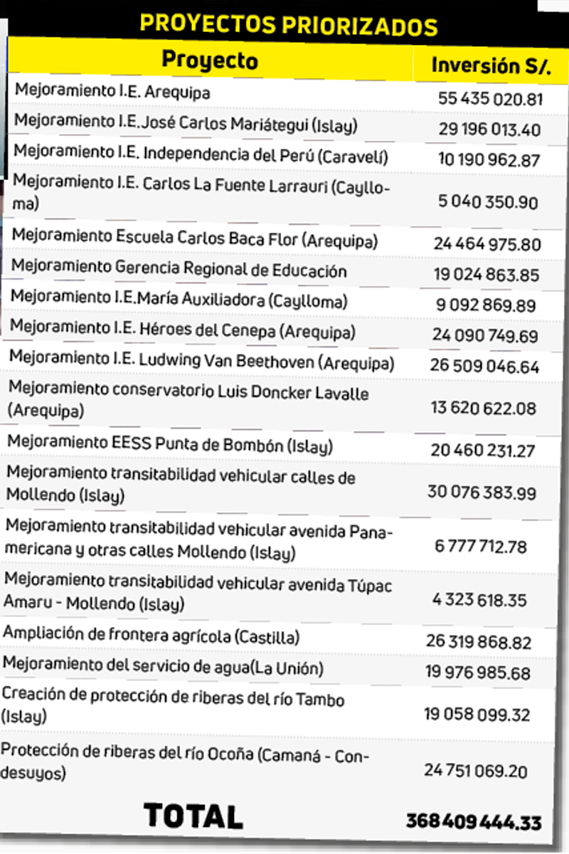 La discusión se inició, luego de la exposición del gerente regional de Promoción de la Inversión Privada del Gobierno Regional de Arequipa (GRA), Elvis Jump Gómez, quien informó que priorizaron 18 proyectos por una inversión aproximada de S/360 millones. (Ver cuadro adjunto)