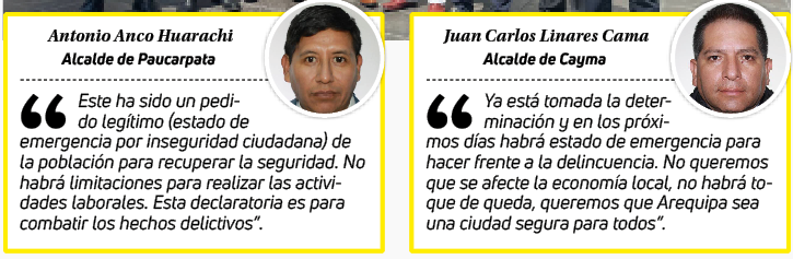 Arequipa será declarada en emergencia por 30 días debido a la inseguridad ciudadana. Aunque la decisión será oficializada el miércoles 17 de abril en sesión de consejo de ministros, “entrará en vigencia entre el 20 a más tardar el 22 de abril”, expresó el alcalde de Yanahuara, Sergio Bolliger Marroquín, tras reunión entre autoridades ediles de Arequipa y la presidenta Dina Boluarte.