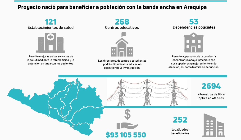 OTRO PROBLEMA. El MTC, mediante su programa Pronatel, tiene un proyecto activo para dotar de internet a Arequipa mediante la banda ancha con un promedio de más de 150 mil beneficiados de 268 colegios, 53 comisarías y 121 centros de salud. Esta iniciativa, según Contraloría, tiene 10 meses de retraso y su instalación aún sigue de manera gradual pese a tener una vigencia de más de 5 años.