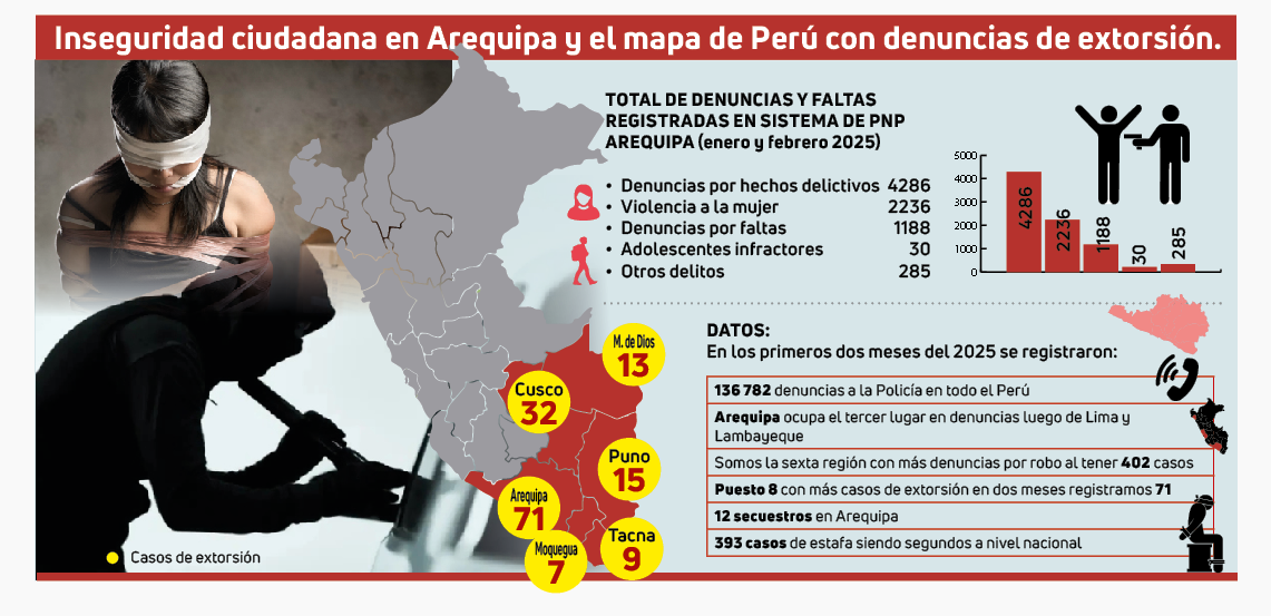 Según el último boletín del Observatorio Nacional de Seguridad Ciudadana del Ministerio del Interior (Mininter), Arequipa se ubica en el tercer lugar a nivel nacional de regiones con más denuncias en el sistema de la Policía Nacional del Perú durante enero y febrero de 2025. Tenemos 8025 potenciales delitos registrados.