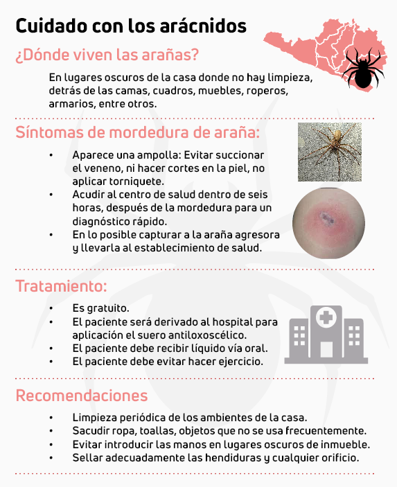 “El veneno de la araña casera es mortal, sino recibimos el tratamiento oportuno y adecuado”, reiteró el especialista de la Gerencia Regional de Salud. Además, Carlos Gonzales recomendó hacer la limpieza constante a los muebles y sacudir las prendas de vestir guardadas después de tiempo.