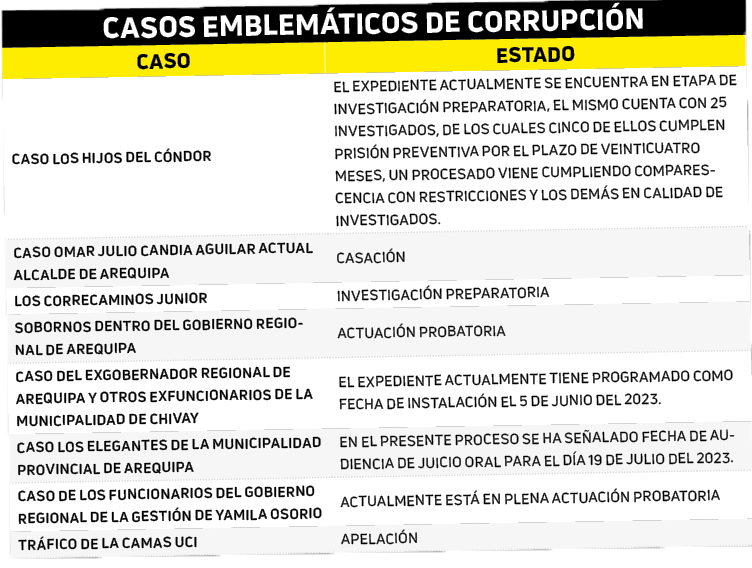 Puso como ejemplo el caso “Los Hijos del Cóndor”, “Los Correcaminos Junior”, la investigación contra Omar Candia Aguilar, exalcalde de Arequipa, etc.