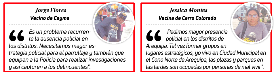 Los ciudadanos expusieron que hay más presencia policial en las calles y patrullaje en las zonas altas de los distritos. Como el Cono Norte de la ciudad, donde personas de mal vivir tomaron las losas deportivas como escenario para realizar fechorías.