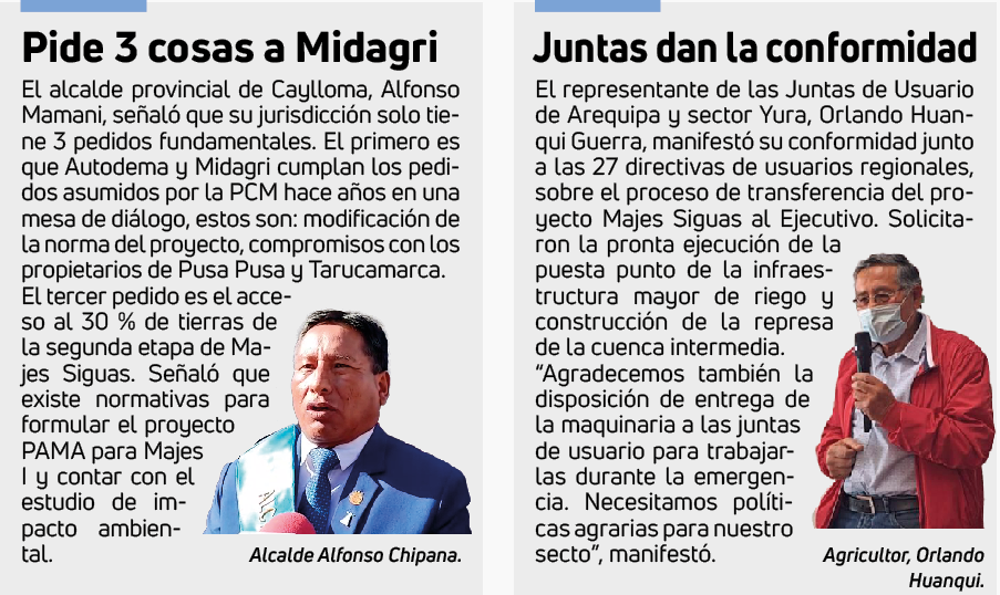 La llegada del titular del Ministerio de Desarrollo Agrario y Riego (Midagri), Ángel Manero Campos, para la ponencia sobre las bondades del traspaso de la administración del proyecto Majes Siguas al Ejecutivo, no terminaron de convencer a las autoridades políticas arequipeñas. El alcalde de Caylloma, Alfonso Mamani y algunos consejeros regionales, se mostraron en contra de dar la titularidad de la obra cuando no se tiene un futuro asegurado.