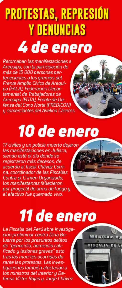 PRESIDENTA. Asimismo, criticó las pocas acciones de solución que ofrece Dina Boluarte a los conflictos sociales. Como se recuerda, asumió el máximo cargo del Perú el 7 de diciembre, tras la vacancia de Pedro Castillo, el 11 de enero el Congreso otorgó el voto de confianza a su gabinete ministerial presidido por Alberto Otárola Peñaranda y en la actualidad es investigada por la Fiscalía por el delito de genocidio.