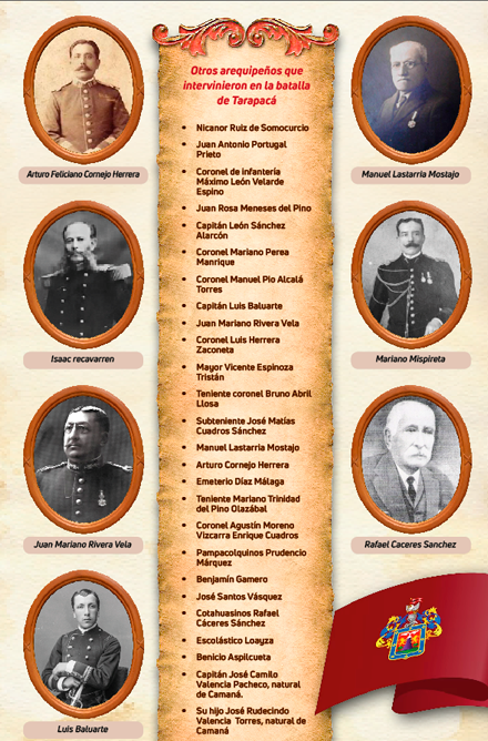Lamentablemente siempre se ha tratado de minimizar la participación de los arequipeños en la nefasta guerra con Chile, cuando en realidad son numerosos los hijos de esta tierra que derramaron su valiosa sangre en el campo de batalla, así tenemos que en Tarapacá murieron los capitanes Enrique Vargas y Carlos Alberto Odiaga, del batallón “Cazadores de la Guardia Nro. 7”, el capitán Clodomiro Chávez Valdivia y el artesano Mariano Paz, ambos integrantes del Batallón “Guardias de Arequipa”.