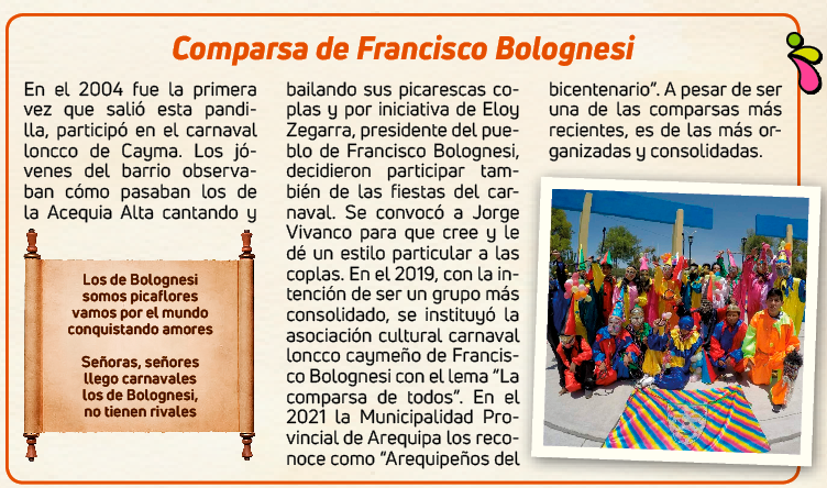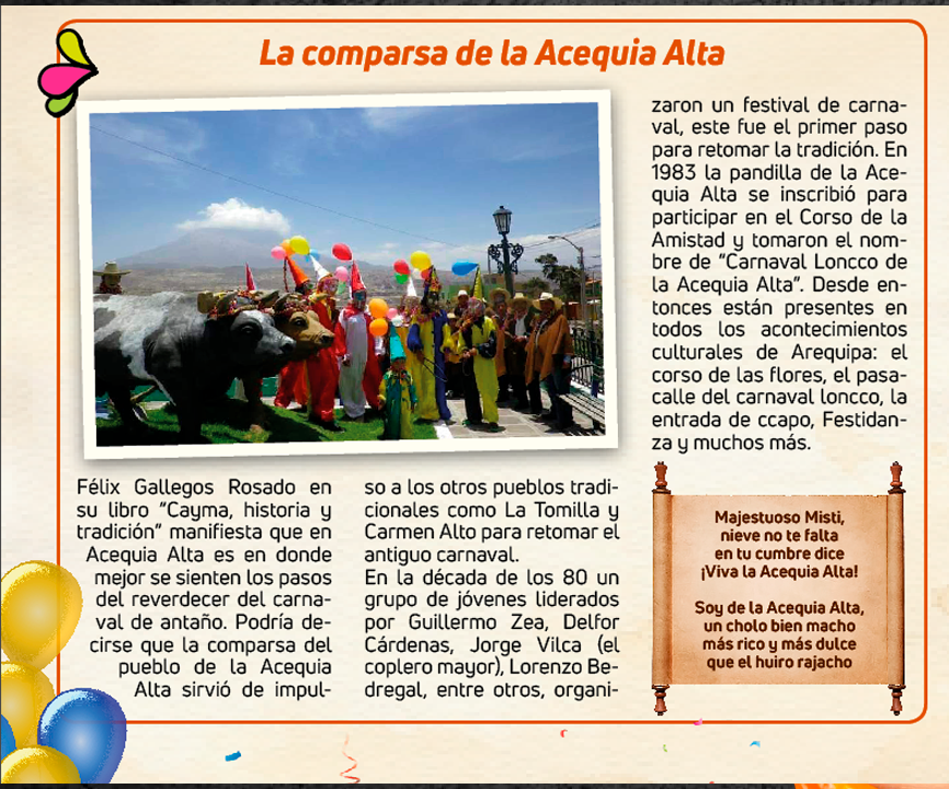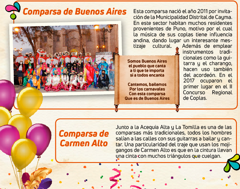 Una de las estampas folklóricas más alegres y pintorescas de nuestra tierra son las fiestas de carnavales. Este festejo es una antigua festividad europea, traída al Perú por los conquistadores, se deduce que la primera celebración en Arequipa fue en el año de 1541.
