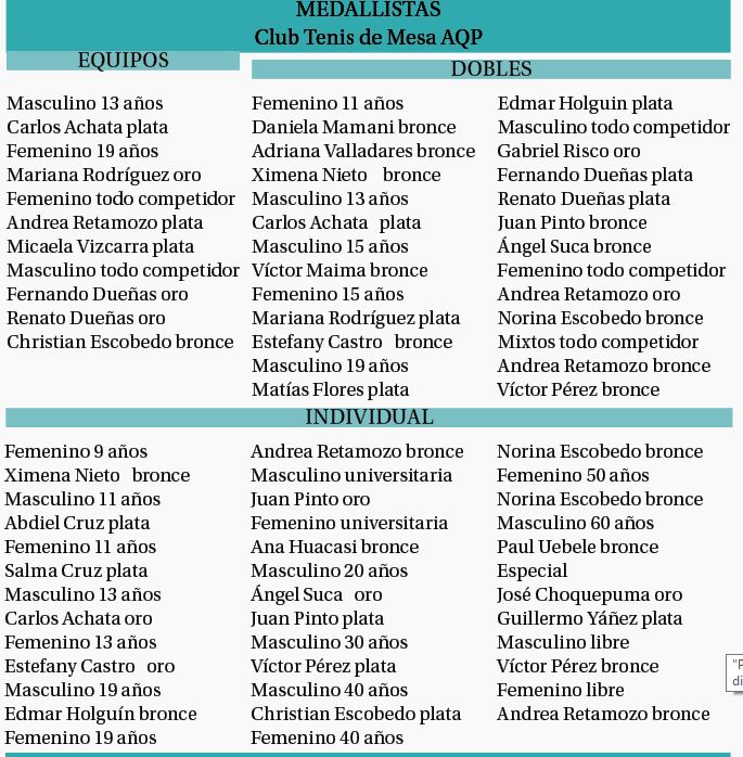 Las entidades mistianas sobresalieron, tal es el caso del club Tenis de Mesa AQP, quien cosechó 45 medallas (10 de oro, 15 de plata y 20 de bronce).