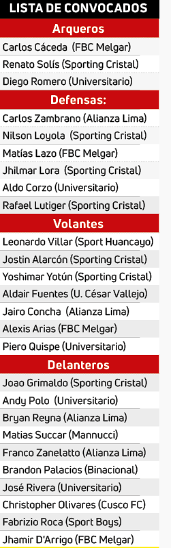 Asimismo, otros nombres que figuran son los de Brandon Palacios (hijo del ‘Chorri’ Palacios), José Rivera, Aldair Fuentes, Leonardo Villar, entre otros. Como se recuerda, muchos de los nuevos convocados son parte del proceso para la selección peruana Sub-23.