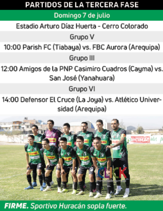 Los clubes Juvenil Cima (Mariano Melgar), Real Católica (Cayma) y Sportivo Huracán (Arequipa) son los tres primeros en certificar su acceso a la fase 4 (hexagonal final) de la etapa Provincial de la Copa Perú.