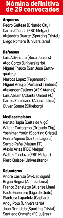 La convocatoria está conformada por 31 jugadores en el que también destaca la presencia de Edison Flores, Paolo Guerrero, André Carrillo, Renato Tapia, Marco López, Pedro Aquino, Miguel Trauco, Oliver Sonne y Luis Advíncula, entre otros.