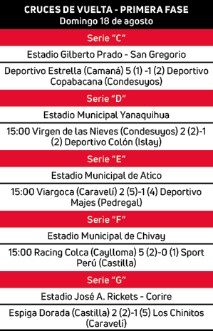 La contienda de la serie B de la primera instancia se disputó este domingo en el estadio Juan Carlos Oblitas, en Puerto Bravo. Vale recordar que los albirrojos vencieron 1-0 en la ida. Los otros ganadores de las demás series que clasificaron son : FBC Aurora (Arequipa), Deportivo Estrella (Camaná), Virgen de las Nieves (Condesuyos), Viargoca (Caravelí), Racing Colca (Caylloma) y Deportivo Chinitos (Caravelí). También avanzó Espiga Dorada (Castilla) que fue el segundo mejor equipo situado de las siete series.