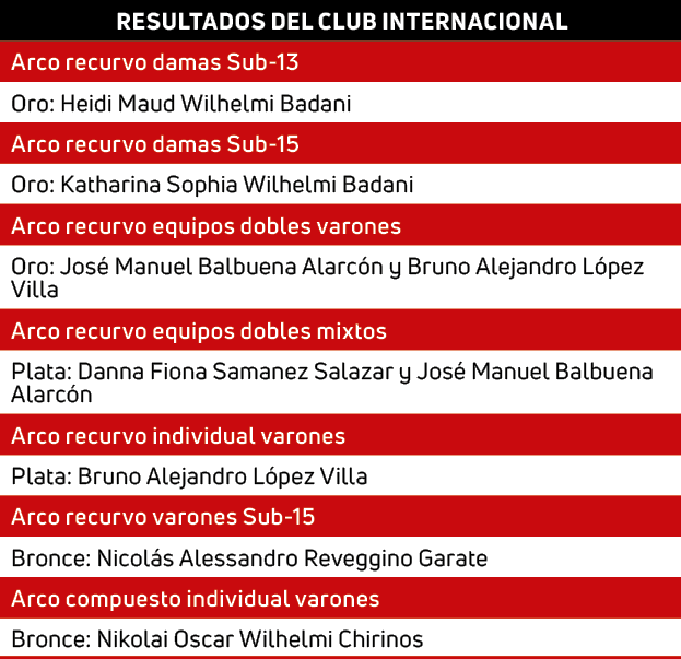 Ellos, del club Internacional, destacaron y acopiaron un total de 9 medallas (4 de oro, 3 de plata y 2 de bronce) en la competencia de las modalidades de arco recurvo y compuesto que fomentó la Federación Deportiva Peruana de Tiro con Arco.