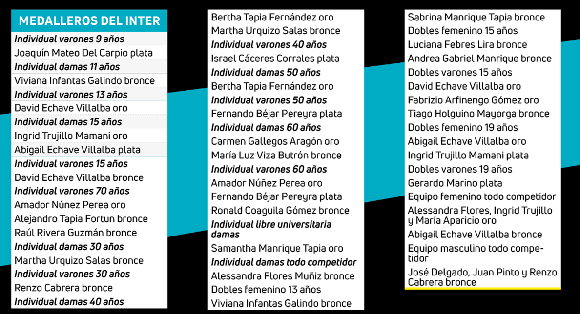 Se adjudicó 40 medallas, 14 de oro, 8 de plata y 18 de bronce en el certamen que llevó adelante en sus propias instalaciones y forma parte del calendario anual de la Federación Peruana de Tenis de Mesa.