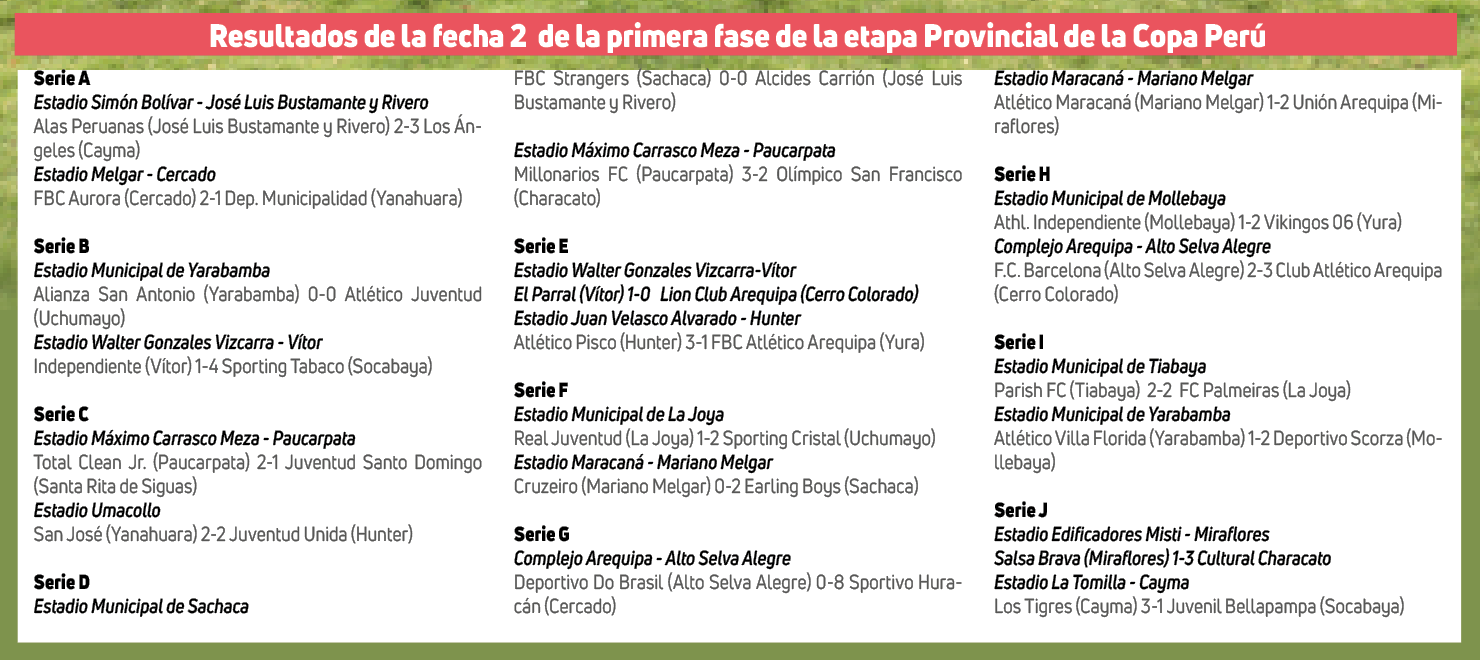 Por ahora seis equipos han tatuado su nombre en la segunda fase de la etapa Provincial de la Copa Perú al concluir este fin de semana la fecha 2 de la primera fase. Se trata de los representativos del Cercado, FBC Aurora y Sportivo Huracán, así como los de Cayma, Los Tigres y Los Ángeles, además de Sporting Cristal de Uchumayo y Atlético Arequipa de Cerro Colorado. Todos ellos decretaron su segundo triunfo seguido por lo que encabezan sus respectivas series.