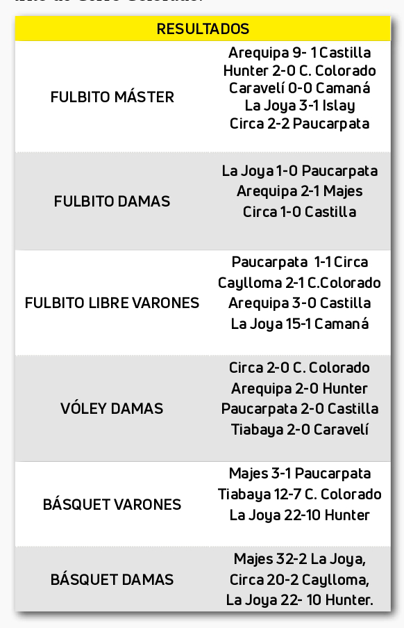Los equipos que van perfilándose con rostros de alcanzar el título del presente año, son las delegaciones de CIRCA, Arequipa y La Joya. Este sábado se dará paso a la etapa semifinal en el complejo de la Derrama Magisterial del distrito de Cerro Colorado.