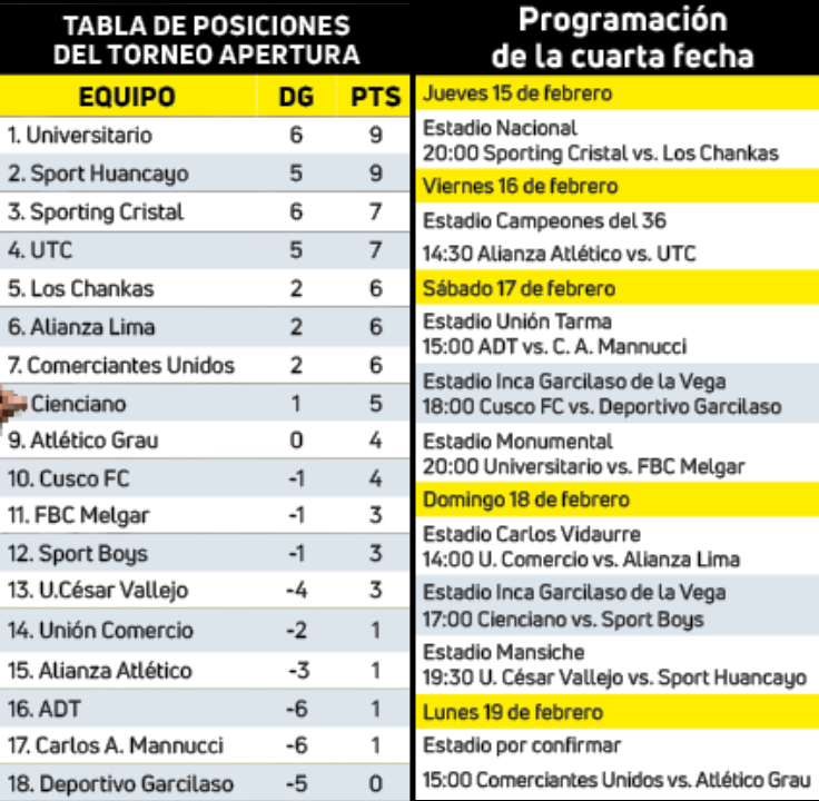 De otro lado este fin de semana se llevará a cabo la cuarta fecha del campeonato. Los cremas recibirán el sábado 17 de febrero a Melgar desde las 20:00 horas en el estadio Monumental. Entre tanto los huancaínos chocarán el domingo 18 de febrero en el Mansiche con la U. César Vallejo a las 19:30 horas.