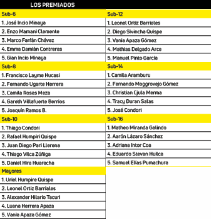 Los cinco primeros de cada categoría se hicieron acreedores a sus respectivos premios. En el caso de los menores ellos se llevaron trofeos, juegos y libros de ajedrez, medallas y diplomas, mientras que los mayores recibieron dinero en efectivo. diplomas, mientras que los mayores recibieron dinero en efectivo.