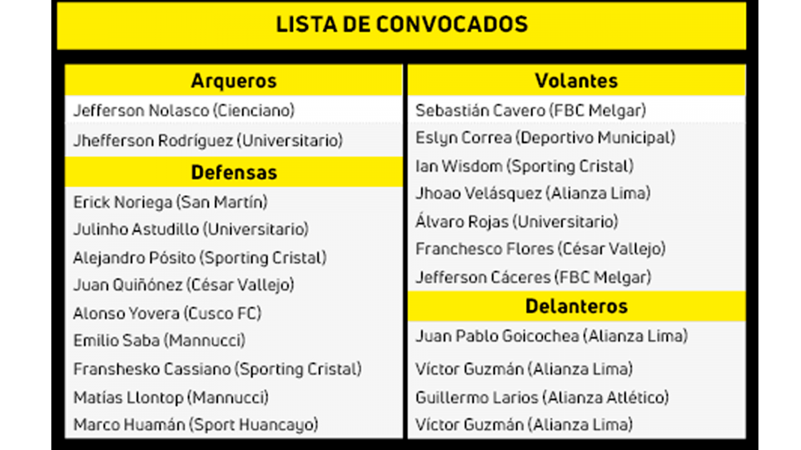 Hay nombres ausentes en la nómina y se debe a que los clubes de la Liga 1 no liberaron a sus elementos para este torneo no reconocido por la FIFA.