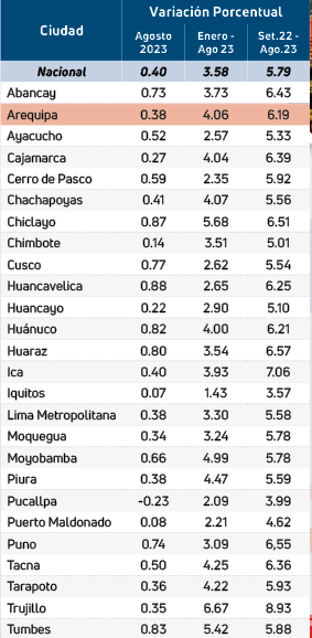 La inflación o variación porcentual de los productos que conforman la canasta básica familiar de Arequipa subieron en agosto a 0.38 %, en lo que va del año a 4.06 % y de setiembre de 2022 hasta agosto de 2023 el incremento fue de 6.19 %, manifestó el docente miembro de la Red de Estudios para el Desarrollo (Redes), Patricio Lewis Zúñiga.