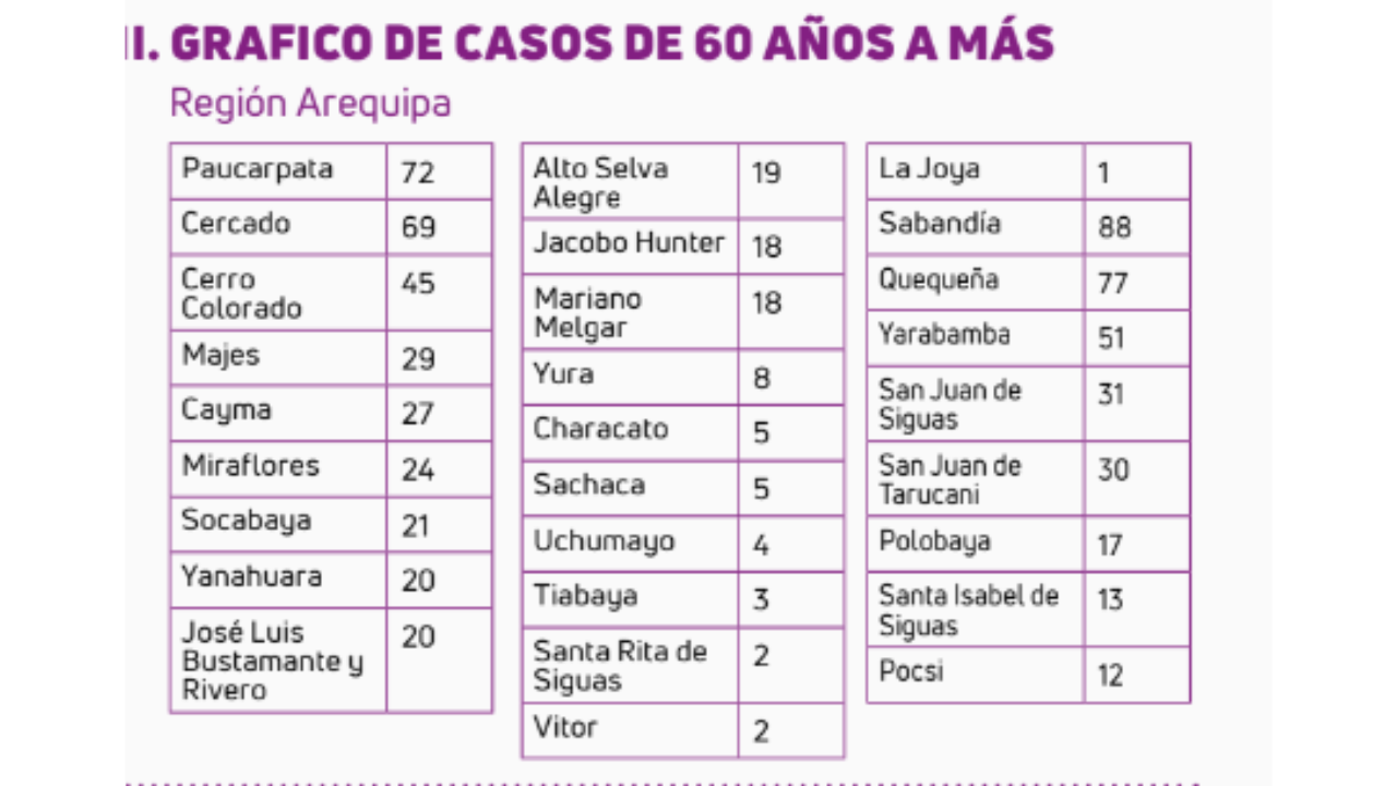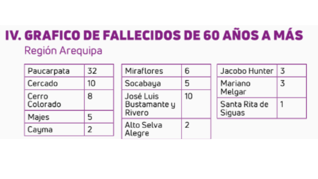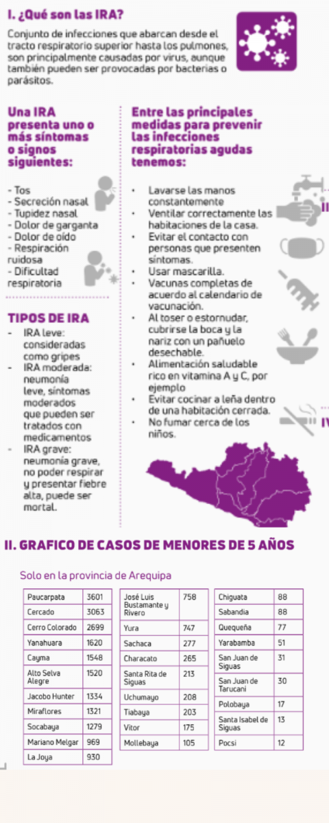 De igual manera, se registró un total de 30 421 casos de Infecciones Respiratorias Agudas (IRA) en menores de cinco años en la ciudad de Arequipa. Lamentablemente, se tuvo el fallecimiento de un niño a causa de esta enfermedad en el distrito de Cerro Colorado. Entre los distritos más afectados se encuentran Paucarpata con 3601 casos, Cercado con 3063, Cerro Colorado con 2699 y Yanahuara con 1620 pacientes reportados.