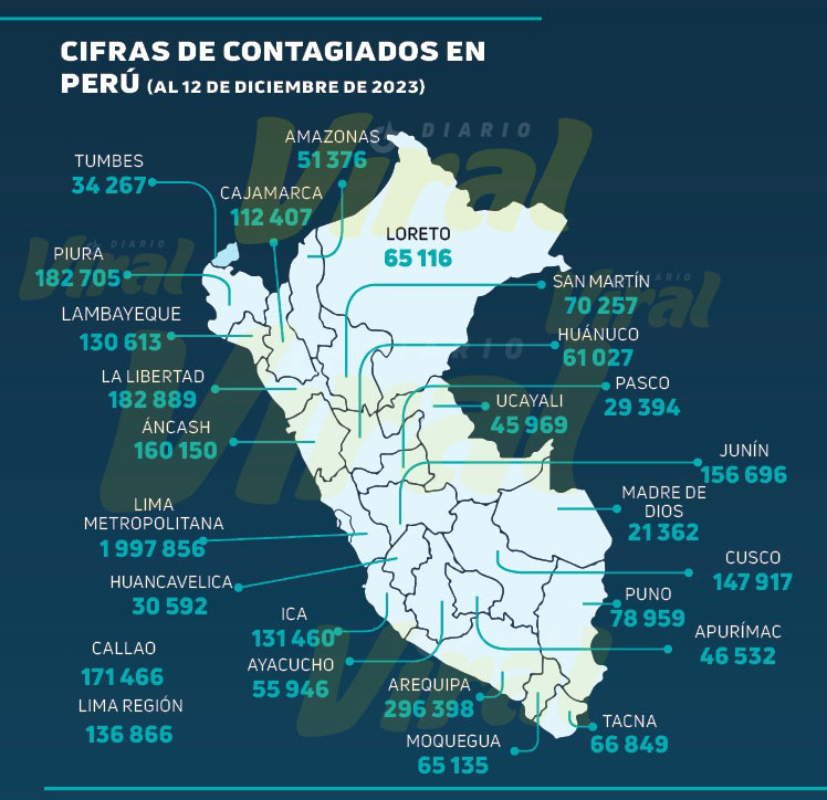 AREQUIPA. Fueron registrados 296 398 casos positivos con el virus SARS-CoV-2, por lo que Arequipa se convirtió en la segunda región con más casos confirmados de la covid-19, solo fue superado por Lima con 1 997 856 casos, según reportes del Instituto Nacional de Salud y Centro Nacional de Epidemiología, Prevención y Control de Enfermedades hasta el 12 de diciembre del 2023. (Ver mapa)
