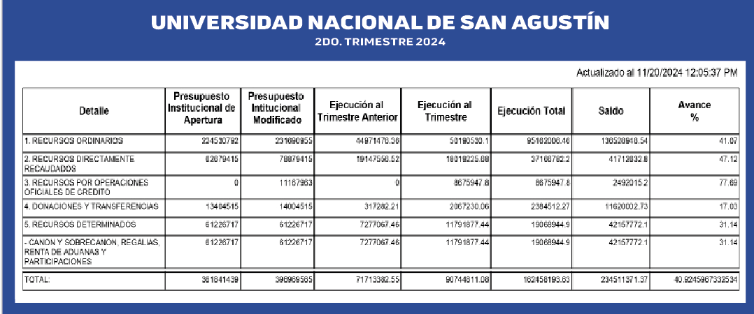 La última actualización del portal Transparencia de la Universidad Nacional de San Agustín (UNSA), detalla que al 20 de noviembre del presente año fiscal 2024, la casa de estudios solo ejecutó el 31.1 % de su presupuesto total de S/61.2 millones que recibió por concepto de canon, sobrecanon y regalías mineras. Presupuesto que debe ser destinado para investigaciones, transferencias tecnológicas, así como capacitar y movilizar docentes.