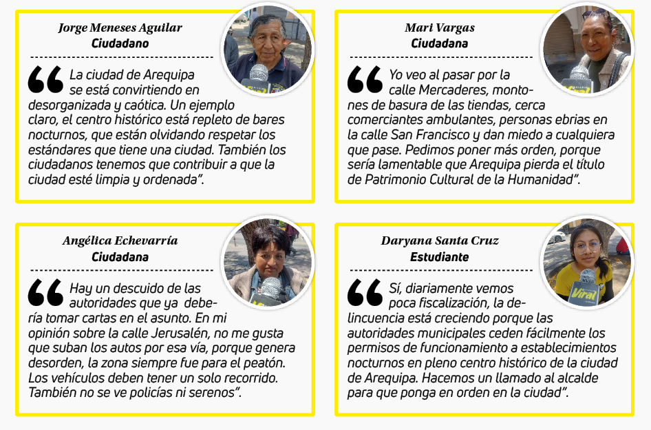 La calle Mercaderes, San Francisco, San Agustín y Santa Catalina son el escenario del desorden. Hace 60 años para el ciudadano Jorge Meneses Aguilar, la ciudad era un modelo a seguir para otras regiones, hoy esto quedó olvidado por la desidia de las autoridades del Municipio Provincial de Arequipa y regidores.