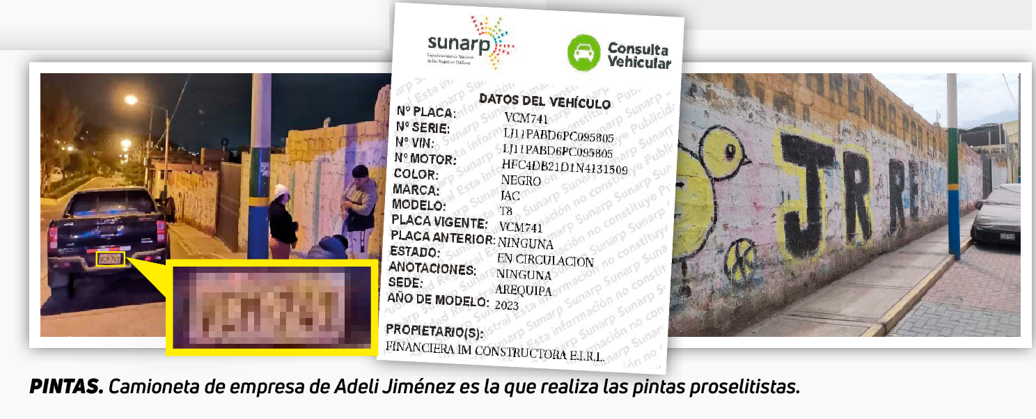 Pero, ¿quien estaría detrás de este pronta campaña política?. Fotografías a la que accedió este medio de comunicación, muestran a personas realizando el pintado, estos llegaron a bordo de una camioneta de placa VCM 741 que se estacionó en la avenida Berlín (Jacobo Hunter). En consulta con Sunarp, la citada matrícula está registrada a nombre de la empresa en cuestión Financiera Im Constructora.