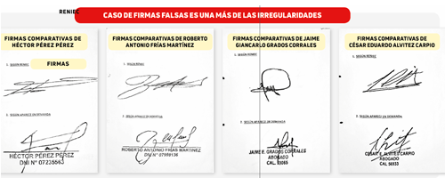 Otro acto escandaloso y arbitrario provocado por el juez denunciado Zoilo Chávez en el mismo expediente, es el que a inicios del año 2016 (dos años después de interpuesta la demanda), los demandados fueron alertados que Héctor Pérez Pérez y Roberto Antonio Frías Martínez, quienes figuran en la demanda, nunca habrían firmado el documento y que las rúbricas habrían sido falsificadas en Arequipa. Con la advertencia se compararon  las firmas con los documentos de identidad donde a simple vista se notaron las grandes diferencias. (Ver fotos).
