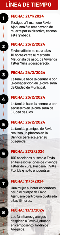 La familia de Favio Ajahuana Lozano (34) busca justicia y están convencidos de que el joven dirigente fue asesinado y no tuvo una muerte natural. Afirman estar decepcionados de la Policía y la Fiscalía.
