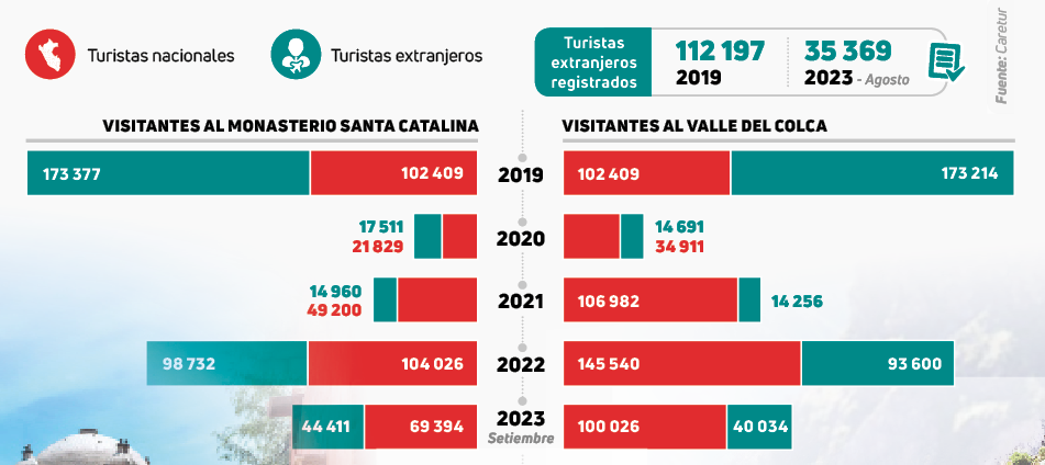 Según la Cámara Regional de Entidades Turísticas de Arequipa, en el 2019 llegaron 112 197 turistas internacionales y este 2023 hasta agosto solo 35 369 a causa de la pandemia, protestas y crisis política