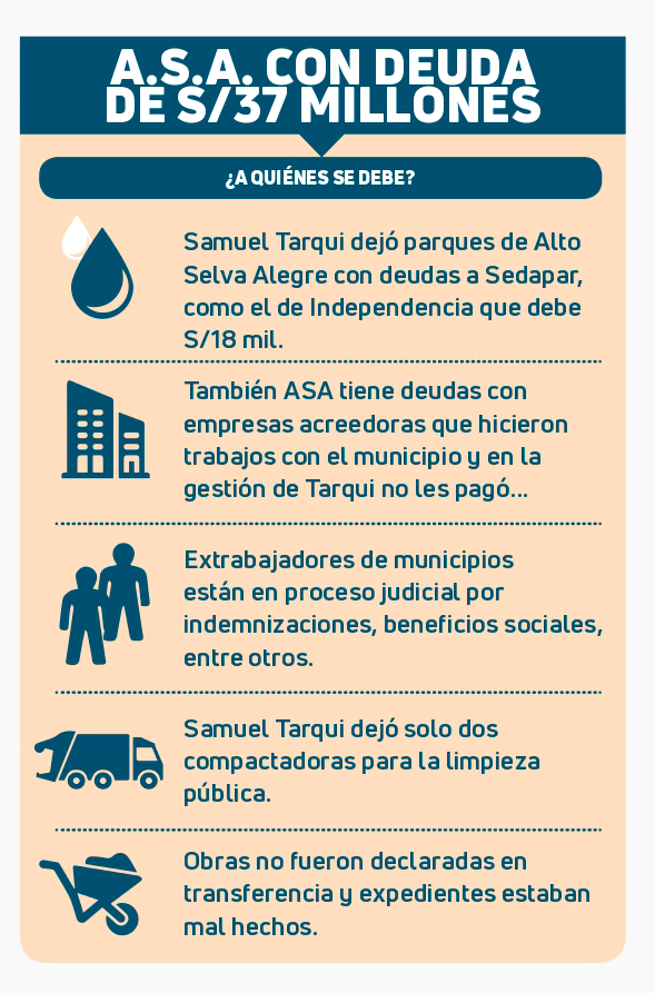 La ineficiencia del exalcalde de Alto Selva Alegre, Samuel Tarqui, provocó que dicho municipio afronte una deuda de S/37 millones, así lo informó el actual burgomaestre, Alfredo Benavente Godoy.
