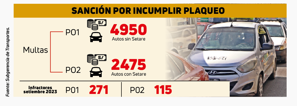 Las sanciones para los hombres del volante que incumplen con el plaqueo varía. La funcionaria explica que la P01 es aplicable para las unidades vehiculares que no tienen autorización para dar el servicio y el P02 es para los formalizados (ver gráfico abajo).