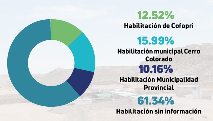 RIESGOS. El informe de Plan de Prevención y Reducción de Riesgos de Desastres del distrito de Cerro Colorado del 2018 al 2026, revela que el 61 % de los predios en las asociaciones de vivienda en el distrito no poseen título de propiedad. Mientras tanto, un sector de la población realiza trámites de formalización de los terrenos que posee (Ver cuadro).