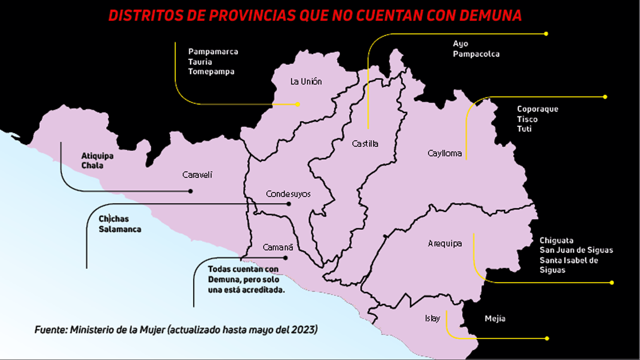 Arequipa. Un menor cuando es agredido y quiere denunciar debe recurrir a la Defensoría Municipal del Niño, Niña y Adolescente (Demuna). Según la ley, todo distrito debe contar con dicho ambiente. Sin embargo, en la región Arequipa no se está cumpliendo, pues 16 jurisdicciones no tienen operativas sus Demuna; ello significa que la víctima (niño, niña, adolescente) no tiene el soporte para que proceda su queja a una fiscalía.