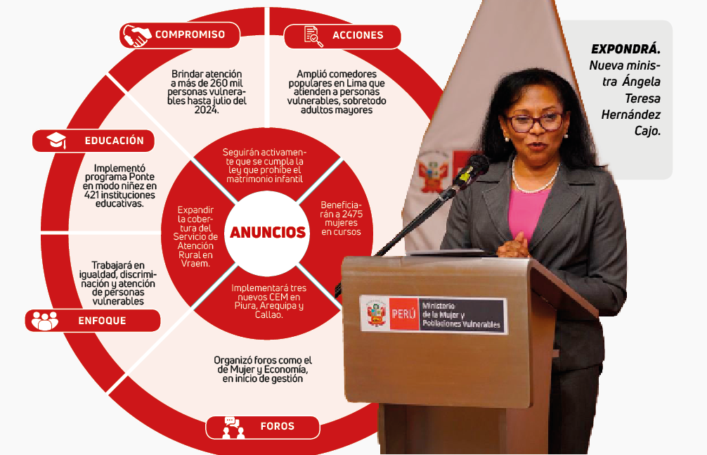 La presidenta Dina Boluarte decidió cambiar tres veces a las titulares del Ministerio de la Mujer y Poblaciones Vulnerables, siendo la última nombrada Ángela Hernández Cajo, quien reemplaza a Nancy Tolentino. La actual ministra aún no expuso su plan de trabajo ante el Congreso y deberá hacerlo hoy a partir de las 14:30 horas frente a la Comisión de la Mujer y Familia.