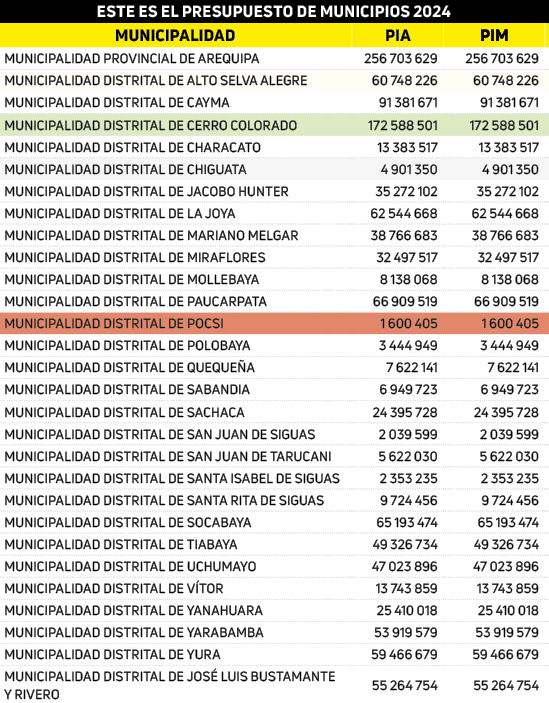 La otra cada de la moneda es el municipio de Pocsi, que tiene como burgomaestre a Andrés Vilca. Esta comuna solo recibirá S/1.6 millones de presupuesto y para sus obras públicas dentro de su jurisdicción tiene S/595 mil soles, el resto de su dinero es para el gasto corriente.