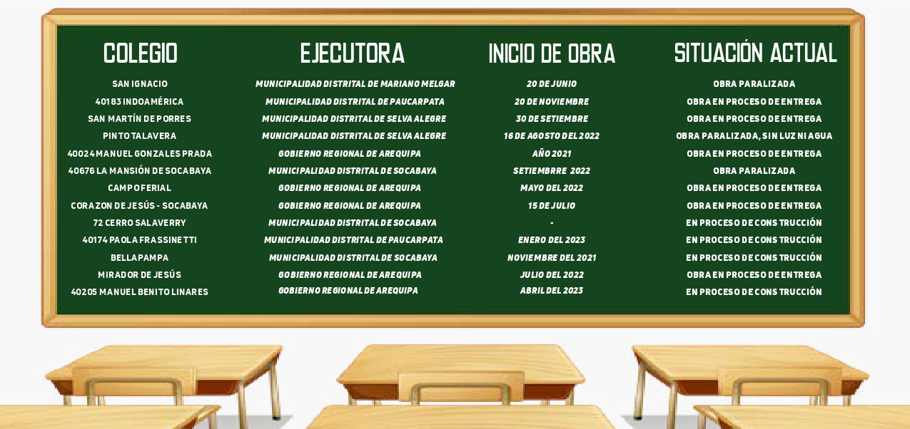 A menos de dos meses para el retorno a clases 2023, cerca de 500 estudiantes de los colegios San Ignacio Circa (Mariano Melgar), Pinto Talavera (Alto Selva Alegre) e inicial La Mansión (Socabaya), se encuentran en un panorama incierto sobre el regreso a sus aulas educativas, ya que dichas municipalidad mantienen dichos proyectos paralizados.